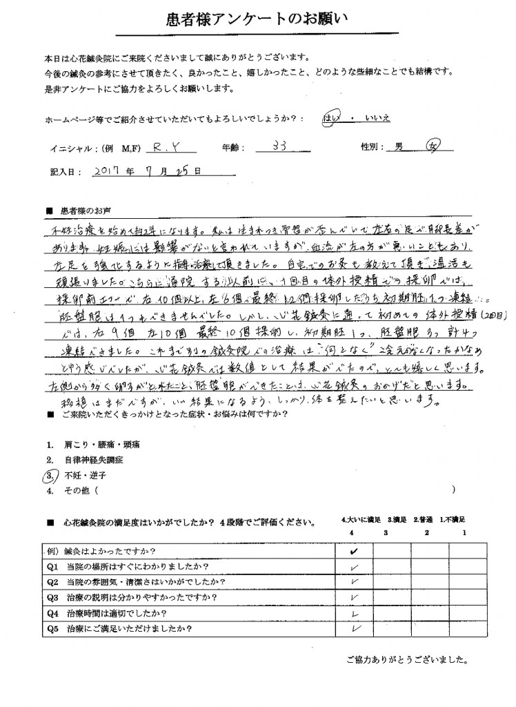 左側から多く卵子がとれたこと、胚盤胞ができたことは、心花鍼灸のおかげだと思います。